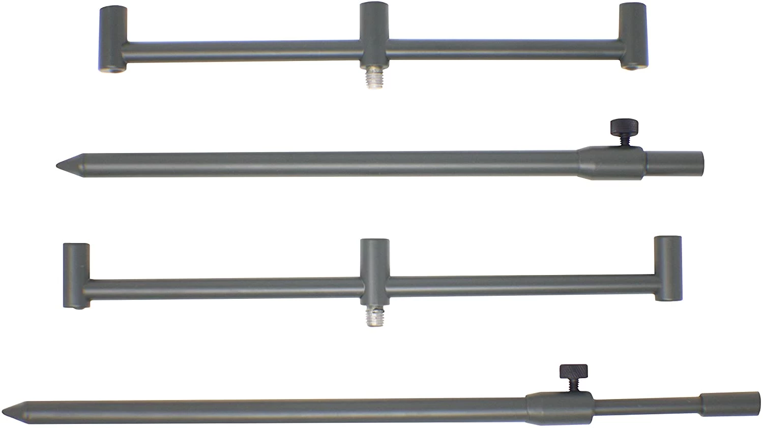 Set of two extendable rod rests with buzz bars. Buzz bar features universal threads making it suitable for most bite alarms and butt rests.