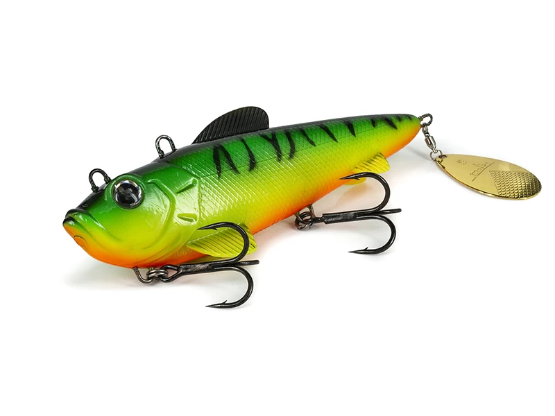 This lure is specifically designed for pike and catfish fishing with a custom-tail-blade that has proven to be super attractive for these predators. The heavy Zinc-Alloy weight allows the lure to be fished in deeper water both casting and jigging. Unlike the lighter baits with the Spin Shad, you can precisely vertical jig even with strong currents or wind, always been able to detect even the most subtle strike. It has two different eyelets depending on the intended use: the front one is ideal for trolling, casting to shallower waters and stop-and-go retrievals, the one in the back makes the lure tilt head-down, swimming close to the bottom during slow retrievals. This is also the most suitable setting for vertical jigging because this way the Spin Shad is perfectly balanced during the rise-and-fall movement of the bait.