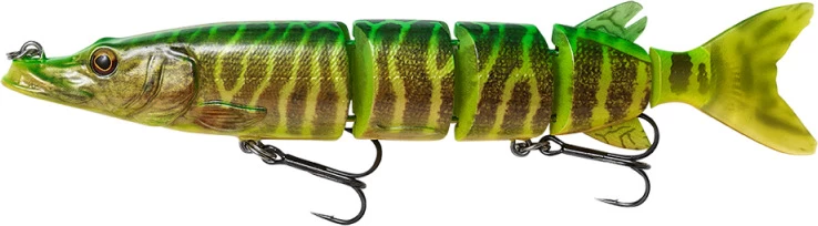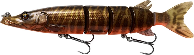 The lure swims with a super realistic slim S-Curve and will turn to the side on the spin stop, triggering strikes from following fish. It has a build-in rattle in the tail section, that will make a provoking click sound on the retrieve. Strong Pin-joints, ultra-sharp strong treble hooks and photoprint details. Great for casting and trolling for Big Pike and Musky.